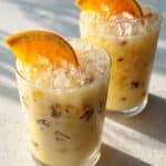 Two clear glasses filled with a creamy, pale yellow drink with small brown pieces evenly mixed throughout. Each glass has a heap of crushed ice on top that looks slightly pinkish from the light, and there is a bright orange slice placed on the rim of each glass. The background is a white marbled surface, giving a clean and fresh look. photo taken with an iphone --ar 4:5 --v 7