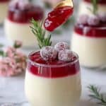 - Assemble and Garnish: Once panna cotta is set, spoon chilled cranberry sauce over each glass to the brim. Skewer one cranberry onto each rosemary sprig using a toothpick and place over each dessert for a festive touch. Cover and refrigerate until serving.