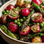This roasted asparagus and radishes dish is a simple yet flavorful way to enjoy spring vegetables. The tangy mustard vinaigrette complements the natural sweetness of the roasted veggies, making it a perfect side for any meal.