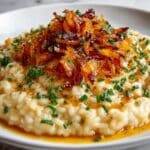 The dish shows a white plate filled with creamy risotto, visible as a soft, thick layer of pale beige rice at the bottom. On top, there is a generous pile of golden-brown caramelized onions that look slightly crispy, adding texture and color contrast. Around the onions, small chopped green herbs are scattered lightly, giving fresh pops of color. A drizzle of amber-colored oil or sauce shines on the edges and some on the risotto itself. The background is a white marbled texture. photo taken with an iphone --ar 4:5 --v 7