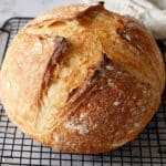 11. Cool and serve: Remove the bread from the oven, place it on a cooling rack, and cover with a damp towel. Let cool for at least one hour before slicing to finish the crumb development and avoid gummy texture.