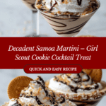 The Samoa Martini transforms the beloved Girl Scout Samoa cookie into a decadent dessert cocktail. Combining chocolate liqueur, vodka, cream of coconut, caramel, and fudge sauces, this rich and creamy martini offers the perfect balance of chocolate, caramel, and coconut flavors. Garnished with chocolate drizzle, whipped cream, toasted coconut, and a Samoa cookie, it’s an indulgent treat ideal for anytime you want a grown-up dessert in a glass.
