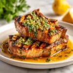 This Sicilian Herb-Crusted Pork Chops recipe features juicy, bone-in pork chops marinated in a vibrant blend of fresh herbs, garlic, and lemon. The pork chops are seared to perfection in a skillet, resulting in a flavorful and aromatic crust that captures the essence of Sicilian cuisine. Perfect for a quick yet impressive dinner, these chops are garnished with fresh parsley and lemon wedges for a bright finish.