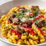 This Spicy Sausage & Roasted Pepper Pasta is a flavorful, hearty dish perfect for a weeknight dinner. With spicy Italian sausage, sweet roasted peppers, and a creamy tomato sauce, it’s a crowd-pleaser that comes together quickly.