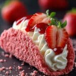 Strawberry Cookie Boats are delightful pink-hued shortbread cookies shaped like little boats, filled with a luscious mascarpone cream, topped with fresh strawberries, and glazed with a sweet strawberry jam. This elegant dessert combines a crisp, buttery cookie base with a creamy, fruity filling, perfect for summer gatherings or special occasions.