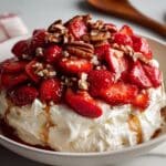 The dish is shown in a white bowl sitting on a white marbled surface. It has multiple layers starting with a thick, fluffy layer of white whipped cream at the base. On top of this, there are bright red, sliced strawberries spread evenly, some partially submerged in the cream. Scattered around and slightly mixed in on the top layer are shiny brown pecans adding a crunchy texture. The strawberries are glossy with a hint of syrup, giving them a fresh and juicy look. In the background, there is a wooden utensil partially visible on the right side. Photo taken with an iphone --ar 4:5 --v 7