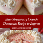 This Strawberry Crunch Cheesecake is a no-bake, layered dessert featuring a buttery vanilla cream cookie crust, a smooth cream cheese and strawberry gelatin filling, and a crunchy topping of crushed vanilla and strawberry wafer cookies. Perfectly chilled and elegantly decorated with piped whipped topping, this cheesecake offers a delightful combination of creamy, fruity, and crunchy textures.