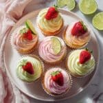 - Step 9: Decorate each cupcake with a sprinkle of granulated sugar, a lime wedge, and a strawberry half for a festive finish.