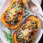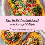This delicious Stuffed Spaghetti Squash recipe combines roasted spaghetti squash halves filled with a savory mixture of spicy Italian sausage, wilted spinach, and crisp apples, all topped with melted cheddar and pepper jack cheese. It’s a flavorful, hearty dish perfect for a comforting dinner with a nutritious twist.