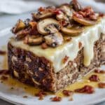 A savory Swiss Bacon Mushroom Meatloaf combining ground beef, crispy bacon, sautéed mushrooms and onions, and melted Swiss cheese, topped with ketchup and baked to perfection. This hearty dish serves six and is perfect for a comforting family dinner.