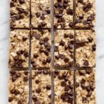 A top view of twelve rectangular granola bars arranged in two neat columns on a white marbled surface. Each bar has a textured mix of light beige oats and golden brown ingredients, with scattered dark brown chocolate chips embedded throughout. The bars show a compact but slightly rough surface, with visible layers of oats and chocolate on each piece, and a slight glossy sheen from the binding ingredients. photo taken with an iphone --ar 4:5 --v 7