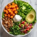 A white bowl sits on a white marbled surface, filled with a colorful, neatly arranged dish. Starting from the top left, there is a layer of bright orange diced sweet potatoes, slightly soft in texture. Next to it, fresh green leafy lettuce creates a frilled border. In the center near the top, a dollop of creamy white sour cream stands out. To the right, a smooth, glossy half of an avocado with the seed removed rests on the lettuce. Below the sweet potatoes to the left, there is a portion of shredded, lightly browned cooked chicken with a slightly dry texture. To the bottom right, a mixture of diced red tomatoes, chopped green cilantro, and small cubes of avocado make a fresh salsa that adds vibrant reds and greens, balanced with a few bits of red onion. The layers are cleanly separated, showing a balanced and fresh meal. Photo taken with an iphone --ar 4:5 --v 7