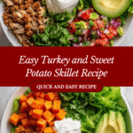 A flavorful and hearty Turkey and Sweet Potato skillet recipe, perfect for a quick and healthy weeknight dinner. Ground turkey is cooked with sautéed sweet potatoes, onions, and taco seasoning, then mixed with melted cheddar cheese. Served warm with fresh toppings like romaine lettuce, Greek yogurt, salsa, and guacamole for a deliciously balanced meal.