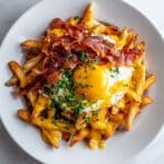 - Assemble Poutine: Divide the hot, crispy hash browns among four individual serving dishes. Top each portion with shredded cheddar and mozzarella cheeses, then ladle the hot gravy generously over the cheese to melt it slightly. Spoon the creamy hollandaise sauce over the gravy. Arrange crumbled beef bacon and place one or two freshly poached eggs on top of each serving. Garnish with freshly chopped chives or parsley, and serve immediately for the best flavor and texture.