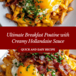 This Ultimate Breakfast Poutine with Creamy Hollandaise Sauce is a decadent twist on the classic Canadian dish. Crispy baked hash browns are layered with savory shredded cheddar and mozzarella cheeses, smothered in rich gravy, and topped with perfectly poached eggs, crumbled beef bacon, and a luscious homemade hollandaise sauce. Finished with fresh chives or parsley, this indulgent breakfast is a satisfying combination of textures and flavors ideal for a special morning treat or brunch gathering.