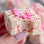Keywords: Valentine’s Day fudge, sugar cookie fudge, white chocolate fudge, no bake fudge, holiday fudge recipe, festive treats, sugar cookie mix fudge, easy fudge recipe