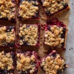 - Cool and Serve: Allow the berry crumble bars to cool completely in the tin. Once cooled, carefully lift them out using the parchment paper, cut into squares, and serve.