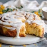 A single-layer round cinnamon roll cake with a golden-brown base topped with a thick layer of white icing that drips down the sides in swirled patterns, placed on a round white marble board with a slice being lifted by a silver spatula, revealing the fluffy, soft texture inside; the background shows a blurred white cloth and some yellow flowers scattered around the white marbled surface. Photo taken with an iphone --ar 4:5 --v 7