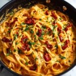 This vegan creamy sun dried tomato pasta recipe features gluten-free fettuccine tossed in a luscious sun-dried tomato sauce enhanced with garlic, balsamic vinegar, and creamy coconut milk. Brightened with fresh arugula and parsley, it offers a wholesome, Italian-inspired plant-based main course that’s both flavorful and satisfying.