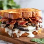 A thick sandwich made with two slices of toasted white bread, each piece darkly browned at the edges and crisp. The bottom slice is spread with a light creamy sauce, topped with a thick, grilled dark mushroom cap. Above the mushroom lies a thick layer of melted creamy white cheese that drapes down the sides. On top of the cheese, several layers of crispy, reddish-brown bacon slices are piled loosely. The top bread slice also has a light spread of the same creamy sauce. The sandwich sits on a wooden board with a few green leaves in the background, all set against a white marbled texture. Photo taken with an iphone --ar 4:5 --v 7