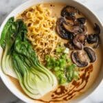 This Vegan Sesame Ramen is a comforting and wholesome dish featuring a rich tahini-based broth that delivers a luxurious sesame flavor. Enhanced with garlic, ginger, and soy sauce, the warm broth is combined with tender ramen noodles, mushrooms, and bok choy for a complete, flavorful meal. Toasted sesame seeds add a delightful crunch and garnish, while optional chili paste provides a gentle heat for those who enjoy it spicy.