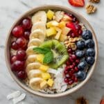- Prepare the Fruits: Rinse all fruits thoroughly under cold water. Hull and quarter the strawberries. Slice the kiwi and bananas, and dice the apple with the skin left on for added fiber. Combine all fruits — strawberries, blueberries, pineapple, kiwi, apple, banana, grapes, and optional pomegranate arils — in a large mixing bowl.