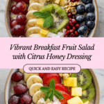 Start your day with a vibrant and refreshing Breakfast Fruit Salad bursting with colors and packed with essential nutrients. This delightful salad combines juicy fruits, crunchy nuts, and a zesty citrus honey dressing, perfect for a quick breakfast, light snack, or brunch. Naturally sweet and customizable with seasonal fruits, it’s a nutritious and easy-to-make dish that will brighten your morning.