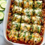 Keywords: zucchini enchiladas, healthy enchiladas, chicken enchiladas, low carb enchiladas, Mexican casserole, zucchini roll ups